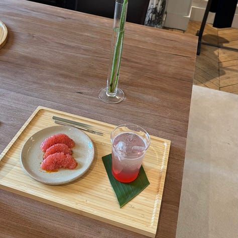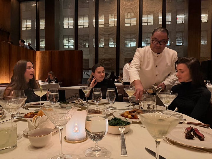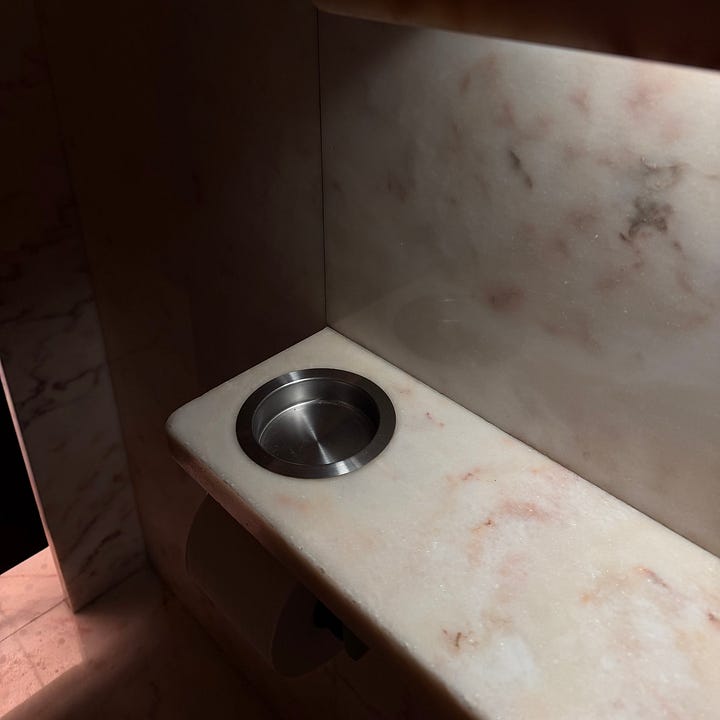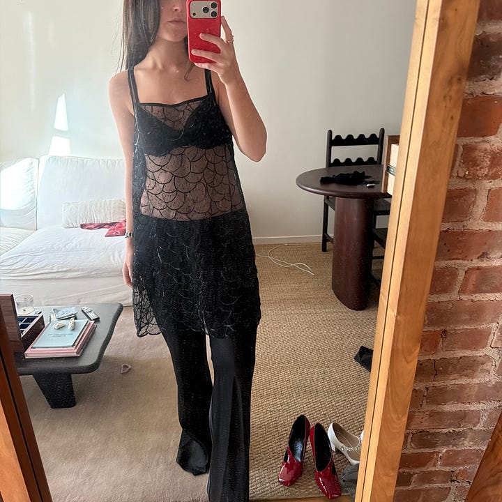 Get dressed up for no reason and go to a fabulous dinner. My friends and I recently spent a Friday night at The Grill. It’s a very special place (complete with a 1940s bathroom, with ashtrays in the stalls). My generous, stylish friend loaned me her beautiful Bode slip , which I paired with my reliable silk pants and patent red Khaite heels.